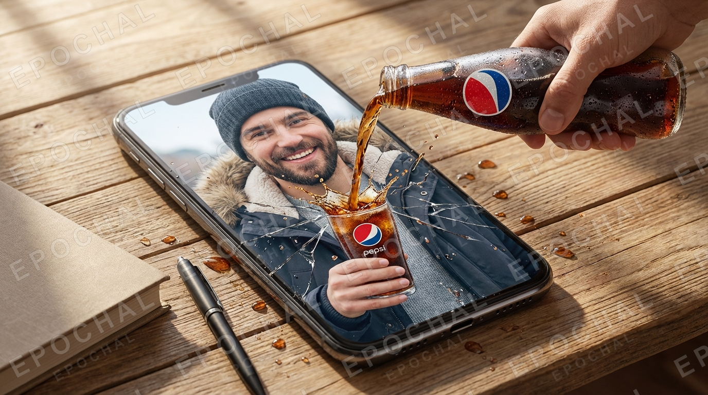 { "SceneType": "Hyper-realistic, surreal composite commercial photograph", "Perspective": "Set on a wooden tabletop", "MainElement": { "Object": "A large, oversized smartphone", "Placement": "Dominates the frame", "Effect": "Creates a strong dimensional-break illusion" }, "InsideTheScreen": { "Subject": { "Reference": "Man from image_0.png", "Appearance": "Appears much larger than normal", "Environment": "Close-up winter environment", "Pose": "Smiling happily, holding a clear glass with a visible Pepsi logo on it" } }, "OutsideTheScreen": { "InteractingHand": "A real human hand", "Action": "Pours dark Pepsi cola from a cold, condensation-covered bottle directly toward the phone screen", "SurrealEffect": "The liquid visually breaks through the display and flows into the glass the man is holding inside the screen" }, "SupportingObjects": [ { "Object": "Closed book", "Placement": "On the wooden table beside the phone" }, { "Object": "Black pen", "Placement": "On the wooden table beside the phone" } ], "StyleAndAtmosphere": { "Lighting": "Warm natural lighting, soft cinematic shadows", "Details": [ "Ultra-sharp liquid splash details", "Hyper-realistic skin texture", "Realistic reflections on the glass and the phone screen" ], "Aesthetic": [ "Surreal cinematic advertising look", "Professional commercial photography quality", "8K realism" ] } }